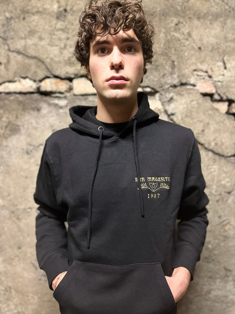 Felpa unisex con cappuccio e marsupio, felpata internamente, cappuccio a doppio strato, occhielli in plastica, cordini con punta in plastica, polsini e orlo inferiore a costine e struttura con cuciture laterali.